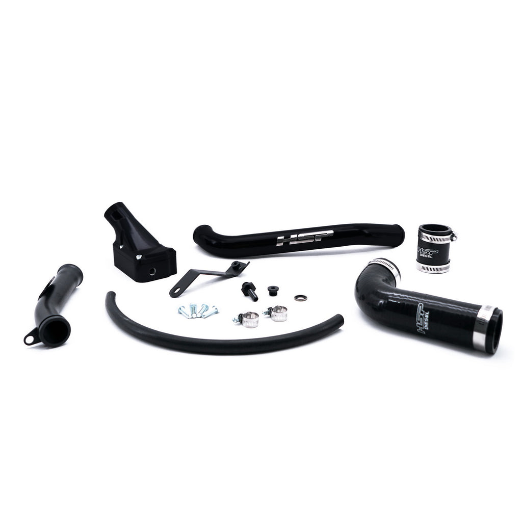 Many of the Chevy Duramax coolant lines are routed in a way that makes it difficult to upgrade turbochargers or other performance accessories. The HSP Diesel team has developed a solution for many of those issues. The all-new billet thermostat housing and tube kit eliminate the factory coolant hose that crosses over the driver side valve cover. This allows more room for aftermarket turbo systems and fuel components. This component is for aftermarket chargers only.