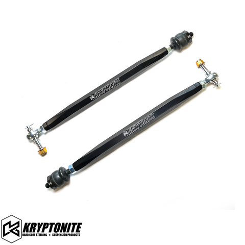 Kryptonite Steering and Suspension introduces our new heavy duty tie rod kit for the Polaris RZR XP 1000 and Turbo. With a solid reputation the Duramax Diesel market, you can now trust our Kryptonite Products on your RZR. Our Tie Rods are made from high strength 6061 T6 aircraft-grade aluminum and are designed and built in the USA. This Tie Rod Kit will completely eliminate factory weak points and give you a solid and reliable steering system. These tie rods come in a hard anodized matte black finish with the Kryptonite logo laser engraved.